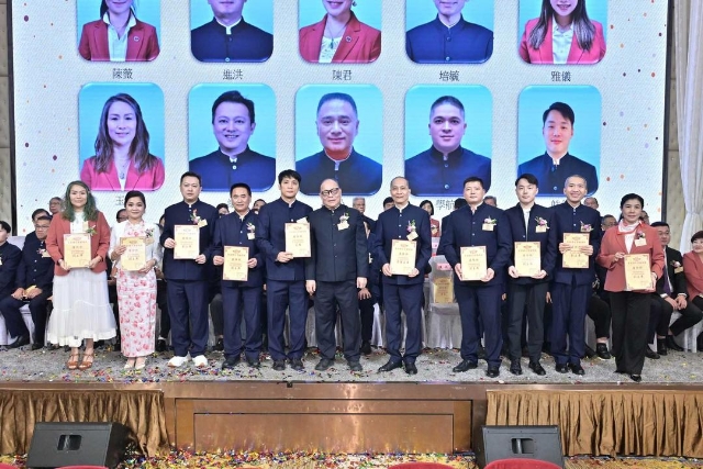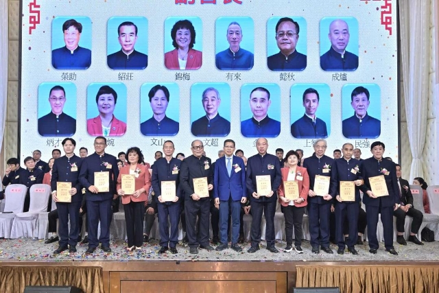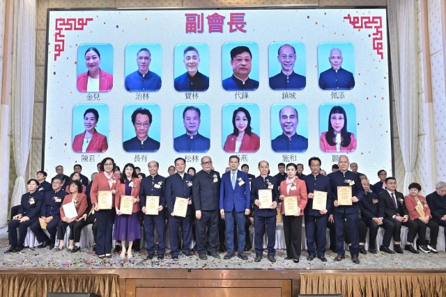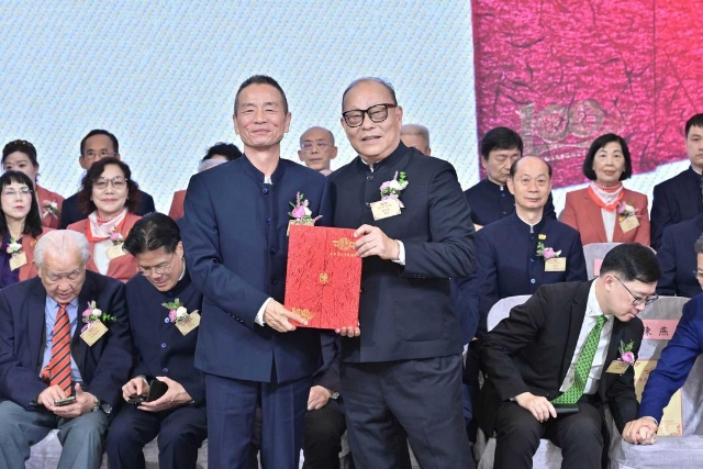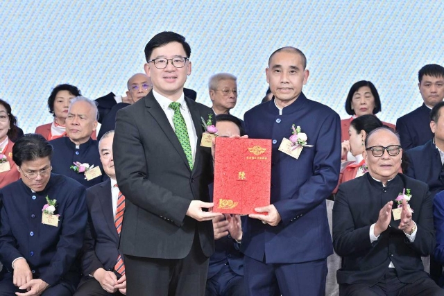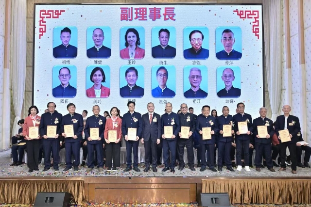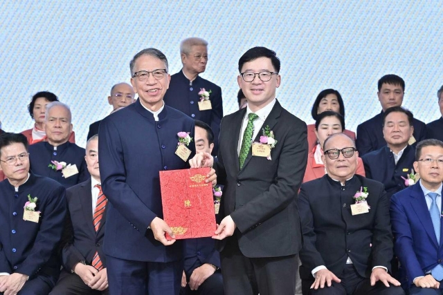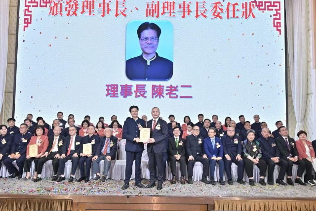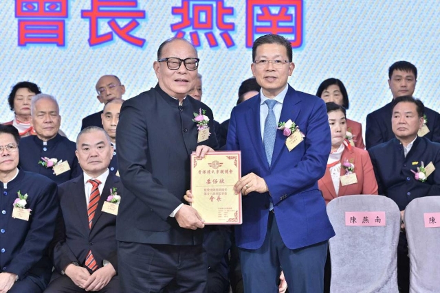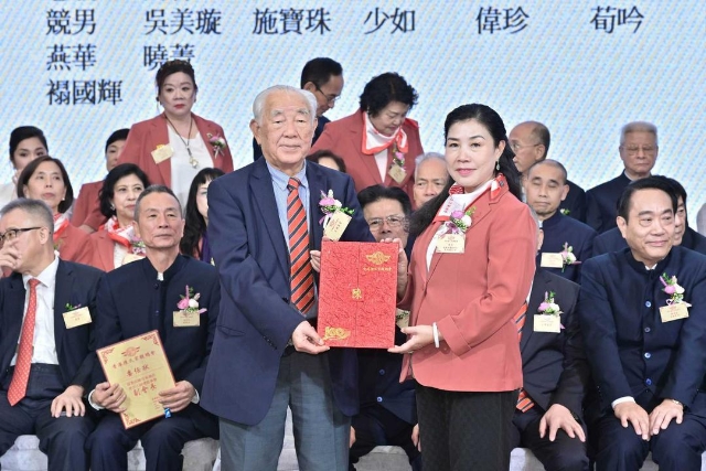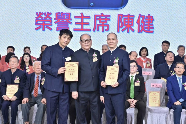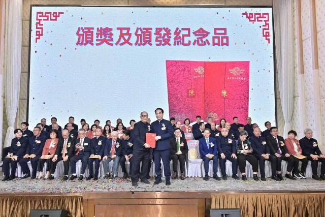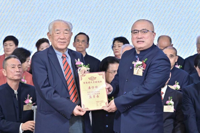 主禮嘉賓胡健民頒發永遠榮譽會長、永遠名譽會長、名譽會長委任狀,陳金鈎副會長代表接受。