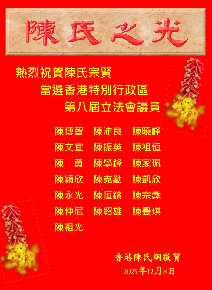 熱烈祝賀陳氏宗賢當選香港特別行政區第八屆立法會議員