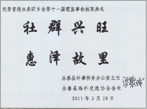 二○一一年三月十二日(星期六)農曆二月初八下午七時卅分假座九龍灣展貿徑一號九龍展貿中心六字樓展貿廳三舉行香港永春同鄉會第十一屆理監事會、永春同鄉福利基金會第八屆董事會就職典禮。