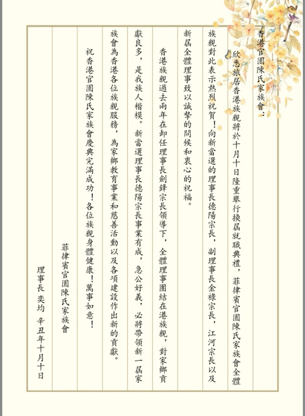 緊接著,由會計陳卿助先作財務報告。再接著,永遠名譽理事長陳慶輝,陳鴻福,陳卿福見証下,由第十三屆陳劍峰理事長,頒授聘任証書予第十四屆理事長陳德陽先生及頒選任証書予副理事長陳金祿先生、陳江河先生。勉勵新一屆理事會再接再厲,再創輝煌!再由第十四屆理事會頒永遠名譽理事長聘任証書及紀念品予陳劍峰先生。完成後由陳德陽理事長緻詞:感謝鎮政府、梅山僑聯、村委會、藍園學村、芸塘村委會、菲律賓陳氏家族會、廈門宗親聯誼會等友好社團發來賀電賀詞,使我們所做的工作更有信心,更有意義。承諾繼續奮發圖強,振興族群,增強青少年對國家的認同感、歸屬感和自豪感,建好香港這個家。禮畢後轉往泓景悅宴酒家,進行晚宴聯歡。