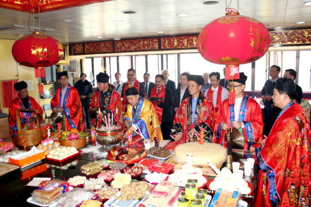 上午九時起鼓,依次請神祈福──消災改厄經──設供──百神燈──犒將一系列法會科儀。本會永名譽主席組、主席組、家鄉來賓列位主香準時到位,南安十六都旅港社團國光校友會、芙蓉同鄉會等諸多鄉親善信來賀來儀。為祖國、為香港、為鄉親祈福,主香信眾男女老少心誠意虔。天公作美,神明庇佑,陽光和煦,冬暖如春,海空曠蕩,雲霞煥彩,瑞氣萬千。