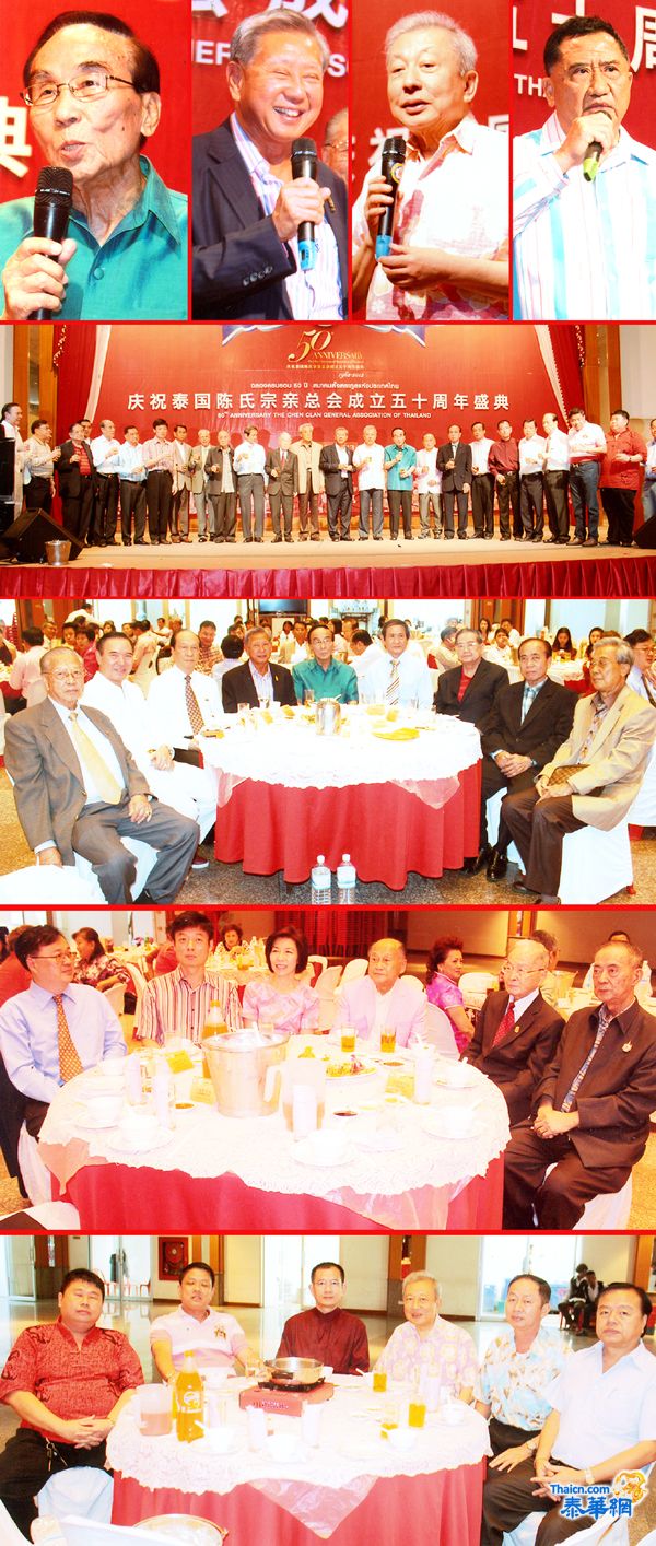 泰國陳氏宗親總會舉行迎春聯歡大會暨五十周年慶典圓滿成功答謝會。一:從左至右:理事長陳靜,永遠榮譽會長陳運樓,五十周年慶典執行主席陳志明分別致詞,陳總副理事長,興僑歌唱團團長陳錦泉歌唱。二:陳靜理事長暨諸首長上臺向大家敬酒賀年。三:理事長陳靜,永遠榮譽會長陳運樓暨陳楚新,陳大頭,陳志欽,陳卓良,陳新國,陳卓興,陳偉光合影。四:陳運教,陳漢濤,陳運忠,陳英榜等合影。五:陳志鴻,陳亮喜,陳鵬,陳金興等合影。