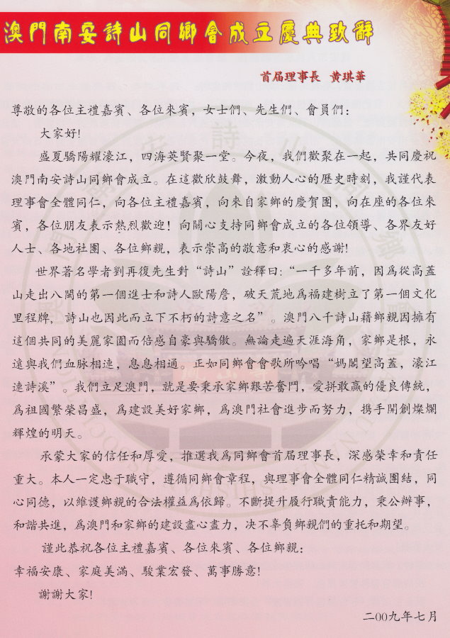 七月廿日下午八時,振奮人心的成立大會及就職典禮在澳門漁人碼頭會展廳隆重開幕,宴開一百五十多桌,座無虛席。首屆會長呂梓煌;首屆理事長黃琪華;澳門特區立法委員陳明金,梁安琪;南安市政協副主席李軍;詩山鎮黨委書記陳創泳等分別致詞,莊嚴的就職宣誓儀式後,表演了精彩的文藝節目,一個鎮級的同鄉會,能有如此高規格的盛大場面,來自各國,地區的慶賀團,無不拍手讚賞,並為身為南安人而自豪。