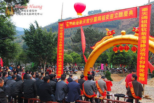 媽祖崇拜源于福建莆田湄州、宋朝普通女子林默娘,其救助人民的事蹟廣泛傳揚,被封為天妃,被譽為和平女神。媽祖廟發祥地是湄州,豎像高大、巍峨、莊嚴、慈祥(出過郵票);最著名的天妃宮在泉州市,是媽祖廟中最早的全國文物保護單位,最近進行封閉修繕;而天妃崇拜遍及世界各地,澳門即是媽祖的意思。永春縣原有媽祖廟兩處,一在原來縣城縣文化館後面,建該館時拆除;二是在岵山鎮龍閣村,其陳氏先祖從浙江遷來之時帶來香火,早年已廢。現在,臺灣信眾把天妃引入永春縣東關鎮外碧村陳坂宮奉祀,今天舉行隆重儀式。乃作詩紀之。