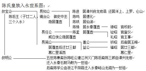 金陵禾黍之悲(易任一夕被斃)。易簡抱器而遁,散兵為民,蔔據廿三都慕仁裏溪西(今石鼓鎮、五裏街鎮)活動以照顧在永子侄。其部分族人分散各地。鏡臺長子進居漳州府龍岩縣,次子鳴居德化,三子珙居仙遊,四子緣居肥湖(今蓬壺)⑤。爾後六百余年間,陳姓蕃衍,分支泉南各地,亦有回遷永春。至宋,陳氏皇族極盛。南宋景炎二年(1277年),陳氏自以世代為宋臣,舉族起兵勤王,併發兵抗元。後兵敗,殉義者不計其數,陳氏皇族遭滅頂之災,族人星散⑥。易簡公後裔永山公於宋末遷居東關蓮內、百四又名掌儀公遷居廿三都慕仁裏溪西,後定居五裏街店前;易任公後裔知柔公裔孫逃往澎湖;易知公後裔陳光裔孫卜居於魁塔。倖存者在極其艱難環境中度日⑦。