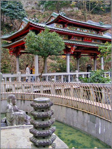 那個秋高氣爽的日子,上午遊覽了清水岩,到虎邱鎮已是下午 2點。從鎮區盤山而上,放眼望去,除了山還是山,層層茶園青翠欲滴。鑽出車來,就看到一山高屹卓立﹐若鳳翥然﹐其峰形如圭﹐這就是圭峰山,周圍峰巒突起。在連綿群山中,點綴著寺廟、流水、小橋、亭榭、新修建的仿古大門、寂靜的小花園……本以為這裏會是青蔥翠綠,花香鳥語;本以為這裏會有名刹古寺,仙山樓閣。然而一切盡在意料之外。可以說是山上有的只是些不知名的灌木和普通平凡的草,看不到一株較高較大的樹,更不用說參天古柏了。這裏也沒有什麼巍峨壯觀、富麗堂皇的廟宇,一座新修的寺廟,有點像恒山的懸空寺,孤零零地坐落在蒼翠的圭峰山的半山腰,出現在眼前的東西很現代,也很人工化。